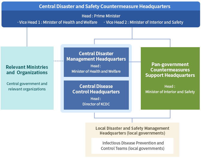 Its first vice head is the Minister of Health and Welfare who is responsible for supporting CDCH as head of the Disaster Management Headquarters and its second vice head is the Minister of the Interior and Safety who is responsible for coordination and cooperation between local governments and the central ministries as head of the Pan-Government Countermeasures Support Headquarters. This structure is remarkable because the Minister of Health and Welfare who usually is the direct superior of the KCDC is put in the role of supporting the CDCH.