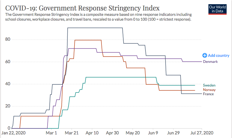 Norway never implemented a total lockdown or very strong measurements in the coronavirus crisis. The hardest and most important restriction was the closure of schools, universities, small business and restaurants. They have been able to keep the infection rate after the first wave at a low level, also without very strong measurements.