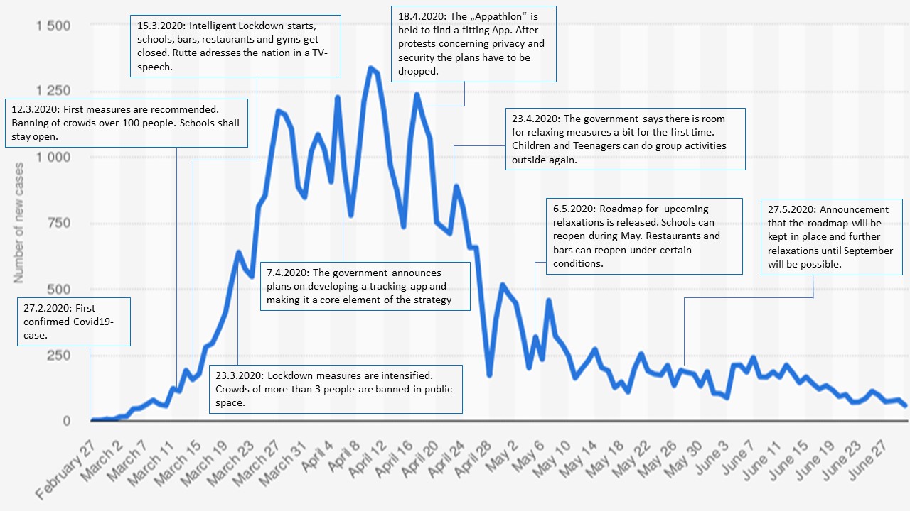Figure 11: Underlying Graphic: Statista, URL: https://www.statista.com/statistics/1101300/coronavirus-cases-in-netherlands/ , with own timeline above Accessed: 29.07.2020