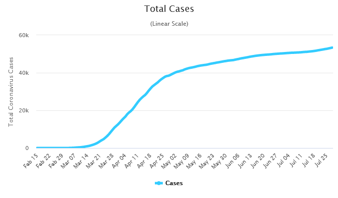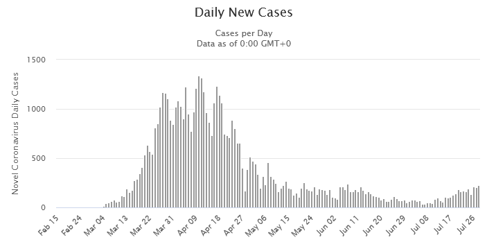 The number of new infections rose steadily from the beginning and peaked around the mid of April. From this point on the numbers decreased overall with some spikes occurring. In the end of July the number of new infections started to rise once again as it did in most European countries. Up until now the country has a number of 53.621 cases of infections and 6.147 people have died as a result of the virus (as of 29th of July 2020).[19]