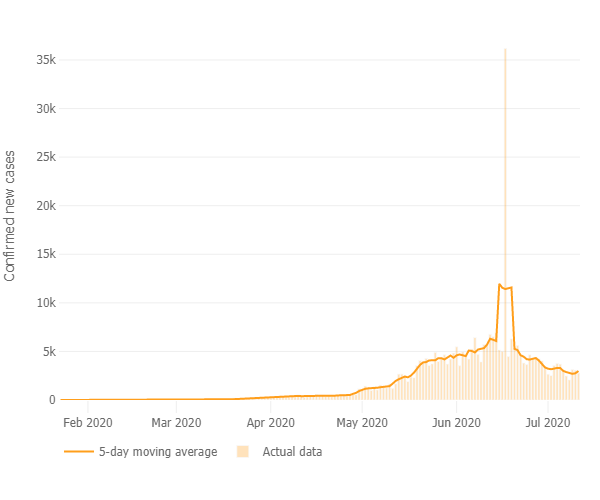 The eye-catching peak in the number of daily confirmed COVID-19 cases is because on June 18, earlier cases have been added to the total number of confirmed cases what explains the massive number of new confirmed cases on that day. The number jumped from 5.013 to 36.179[28] .