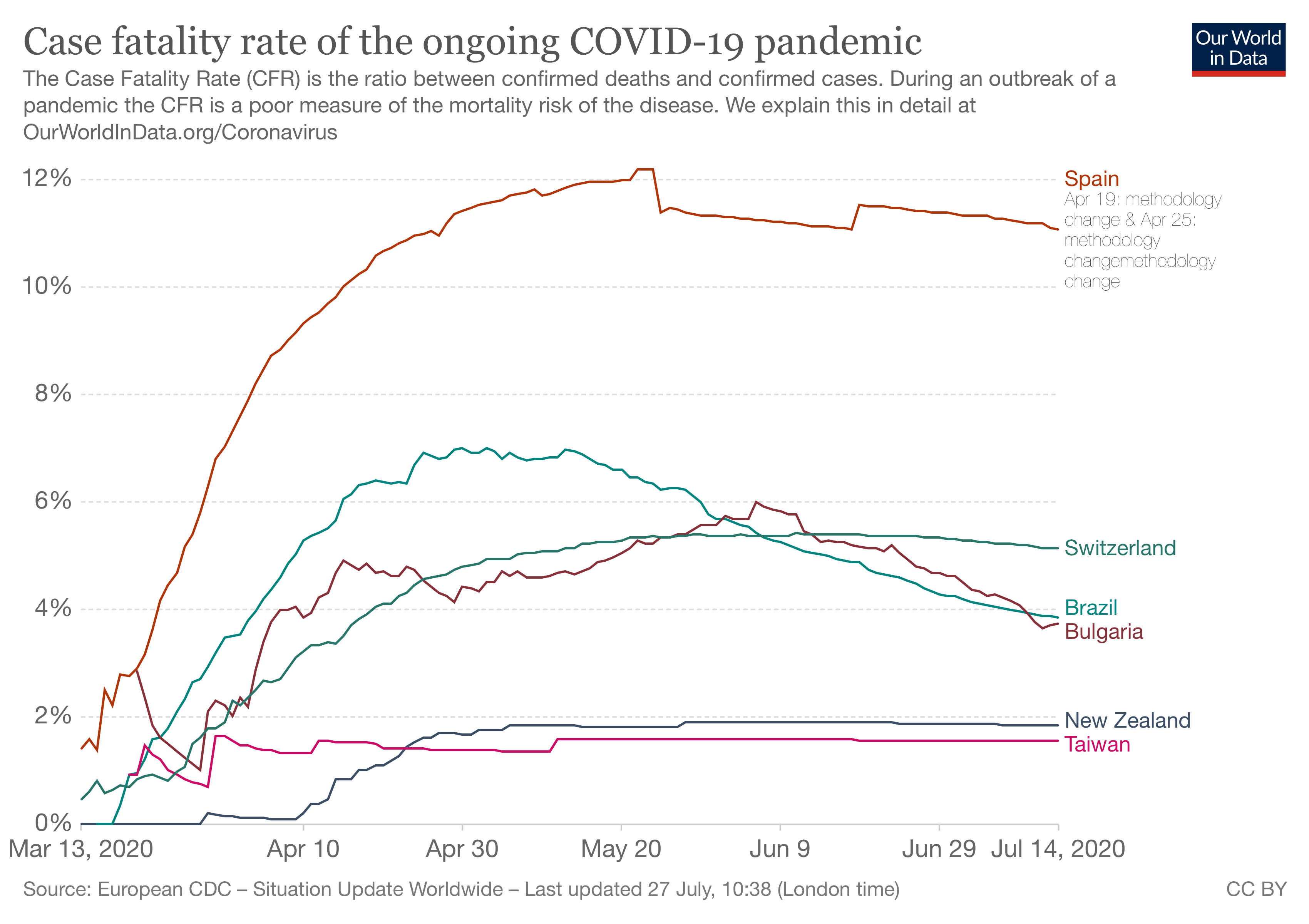 In short, only the CFR can in practice be used to assess the mortality of Covid-19. Looking at data from New Zealand, the case fatality rate has been just under two percent since the end of April, compared to around eleven percent in Spain and five percent in Switzerland. This difference can be attributed to many factors, such as the number of tests processed, the measures put in place by the government, and whether the health care system suffered a collapse.[24]