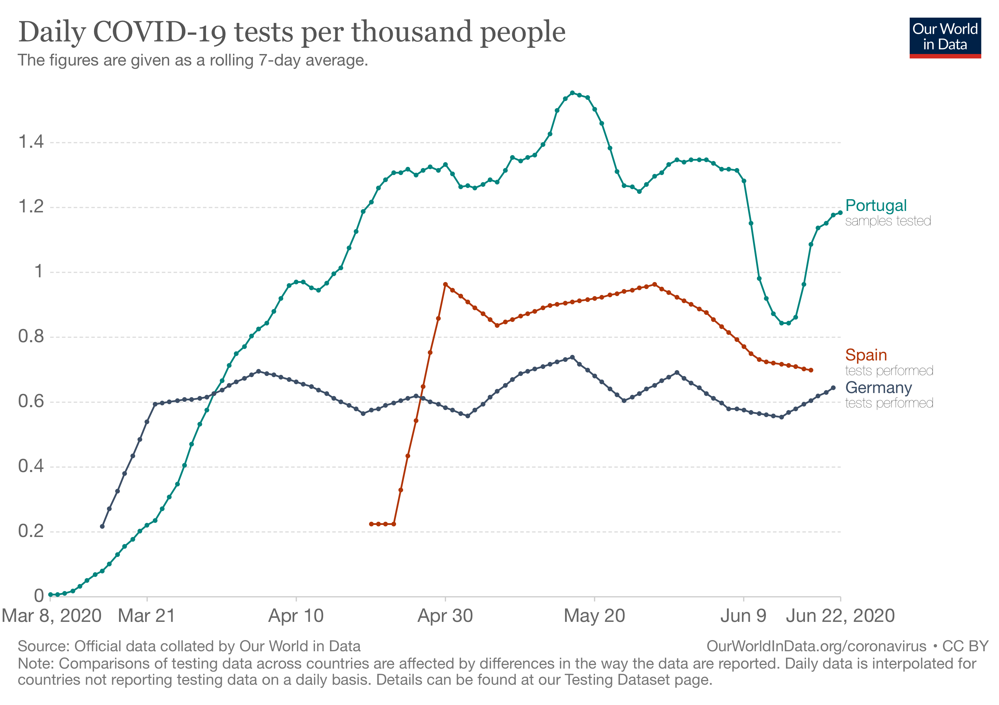 Hereunder I attach a graph where we can observe the differnece in quantitiy of testing made between Spain, Germany and Portugal.